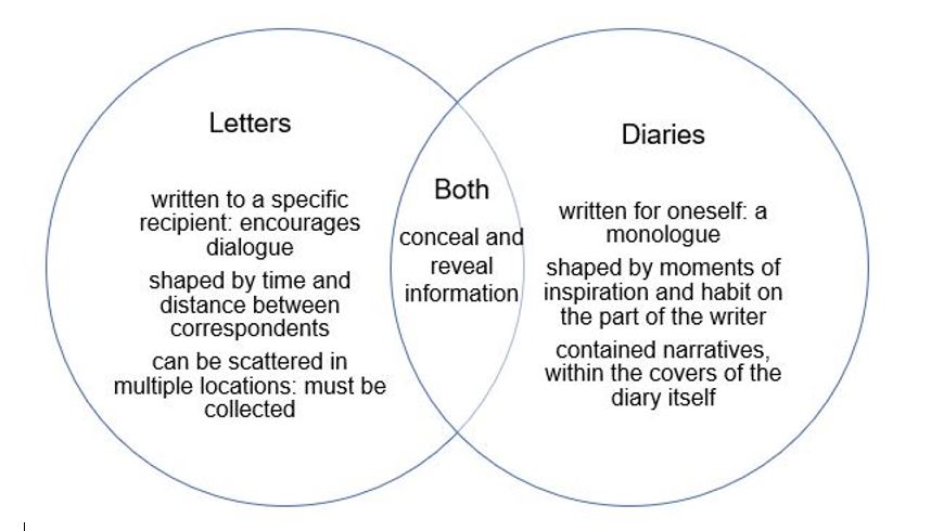 Letters and diaries share some points of difference, and one important similarity, as illustrated in the diagram below: