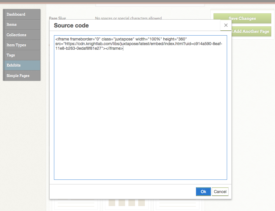 - In the text field that opens, paste the Embed code you copied from the Juxtapose page (in step 6). Click Ok.